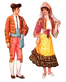 Toreador--This costume consists of a white shirt, dull-red breeches trimmed with gold braid, with jacket to match, light-brown stockings and dark-brown shoes, and a sash of blue silk worn about the waist. A black tie and cap are essential features of this costume, the pattern for which costs 30 cents.